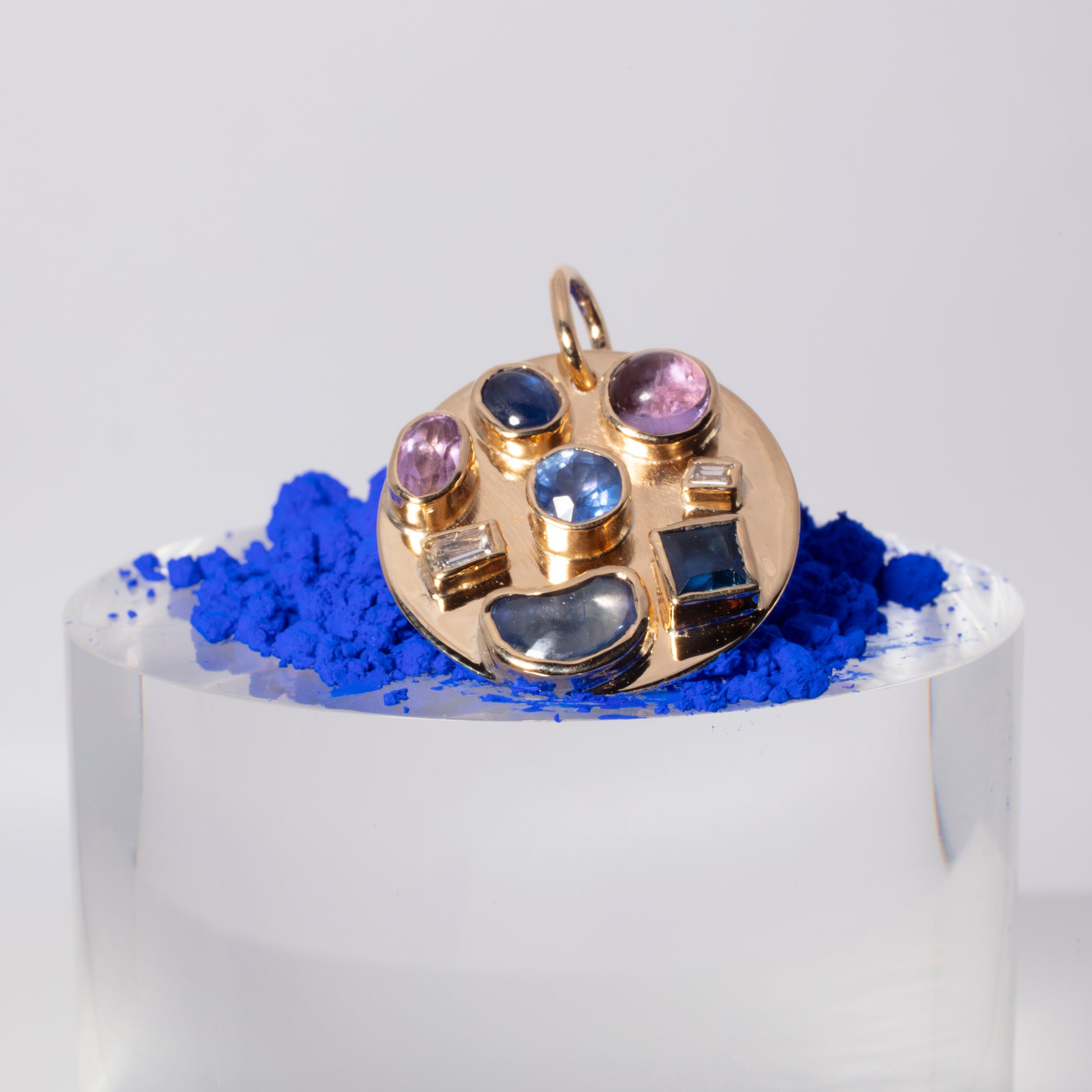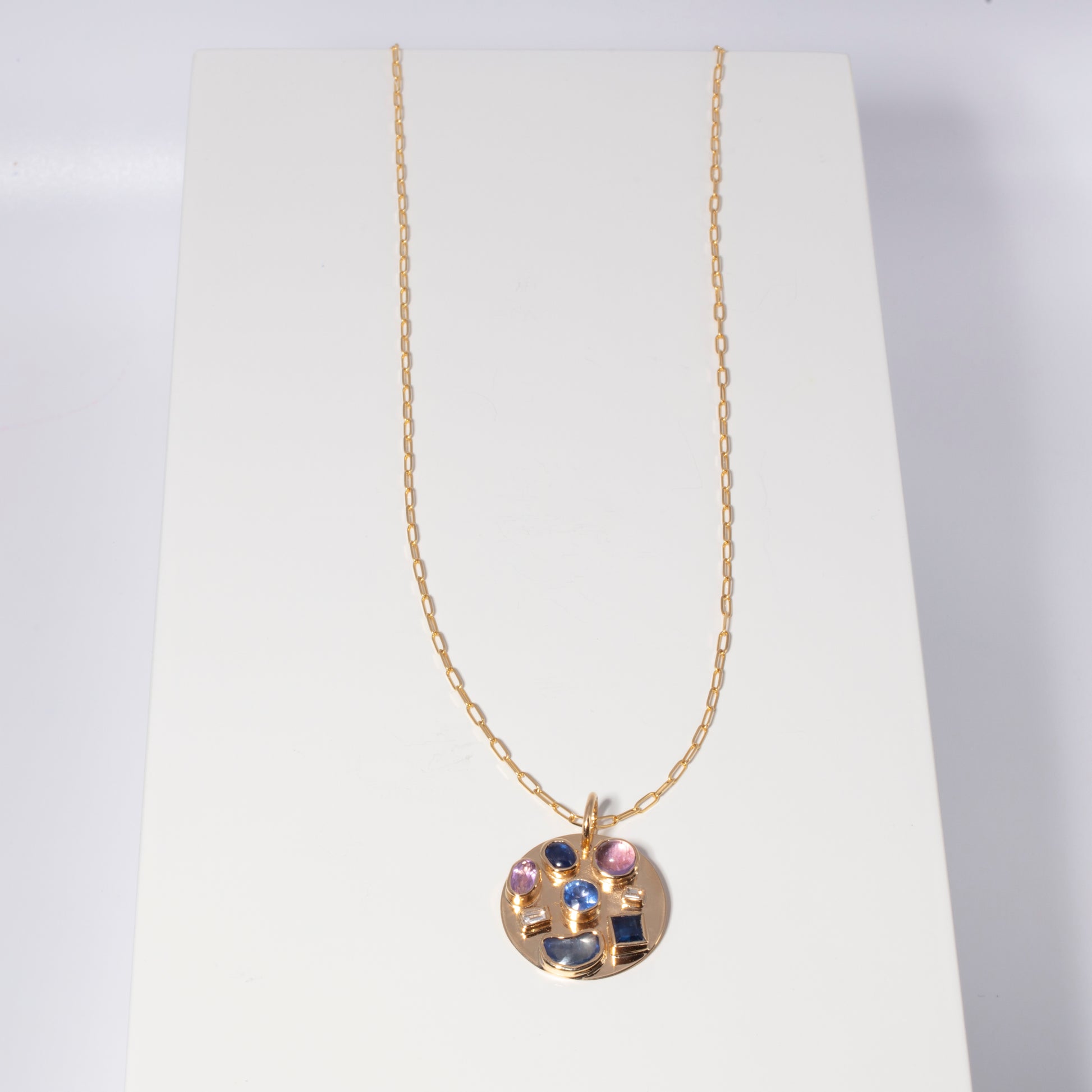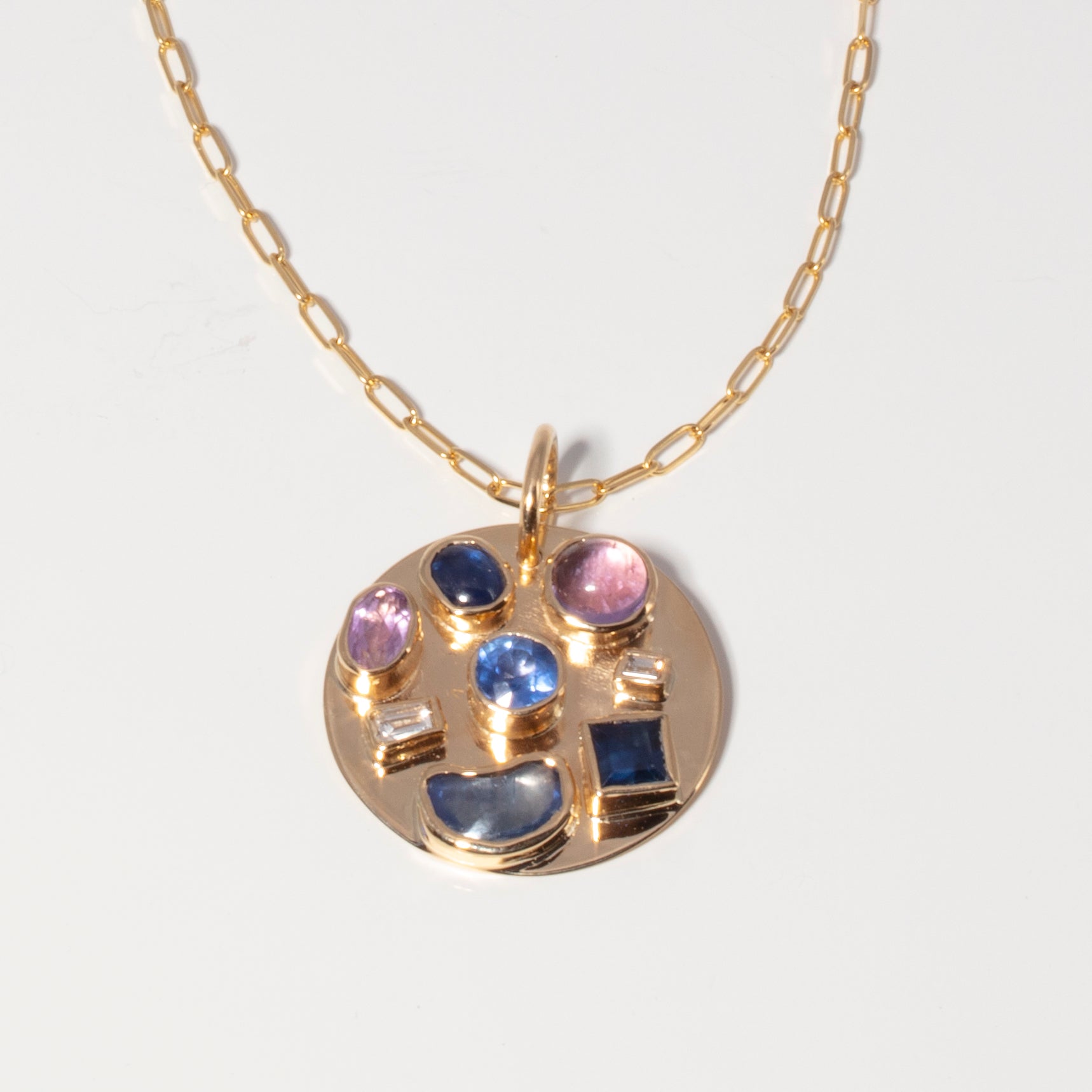 Our confetti disc pendant shines with her dazzling mixture of bezel set precious and semi precious gems. Layer her with your favorites or wear her alone, the Confetti disc pendant is a celebration all on her own.