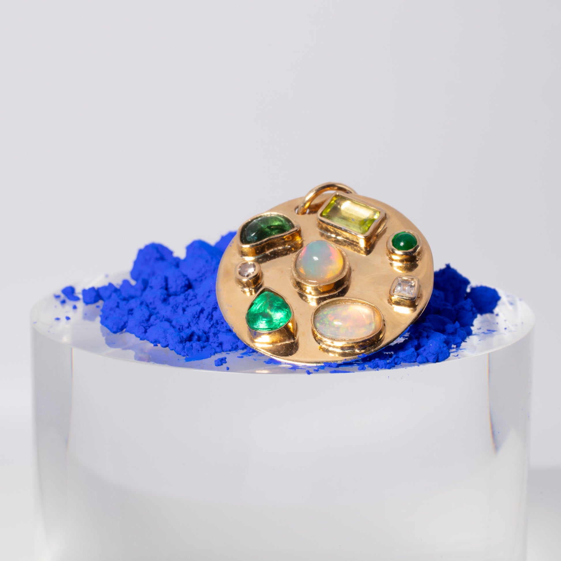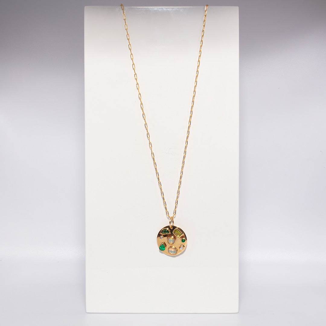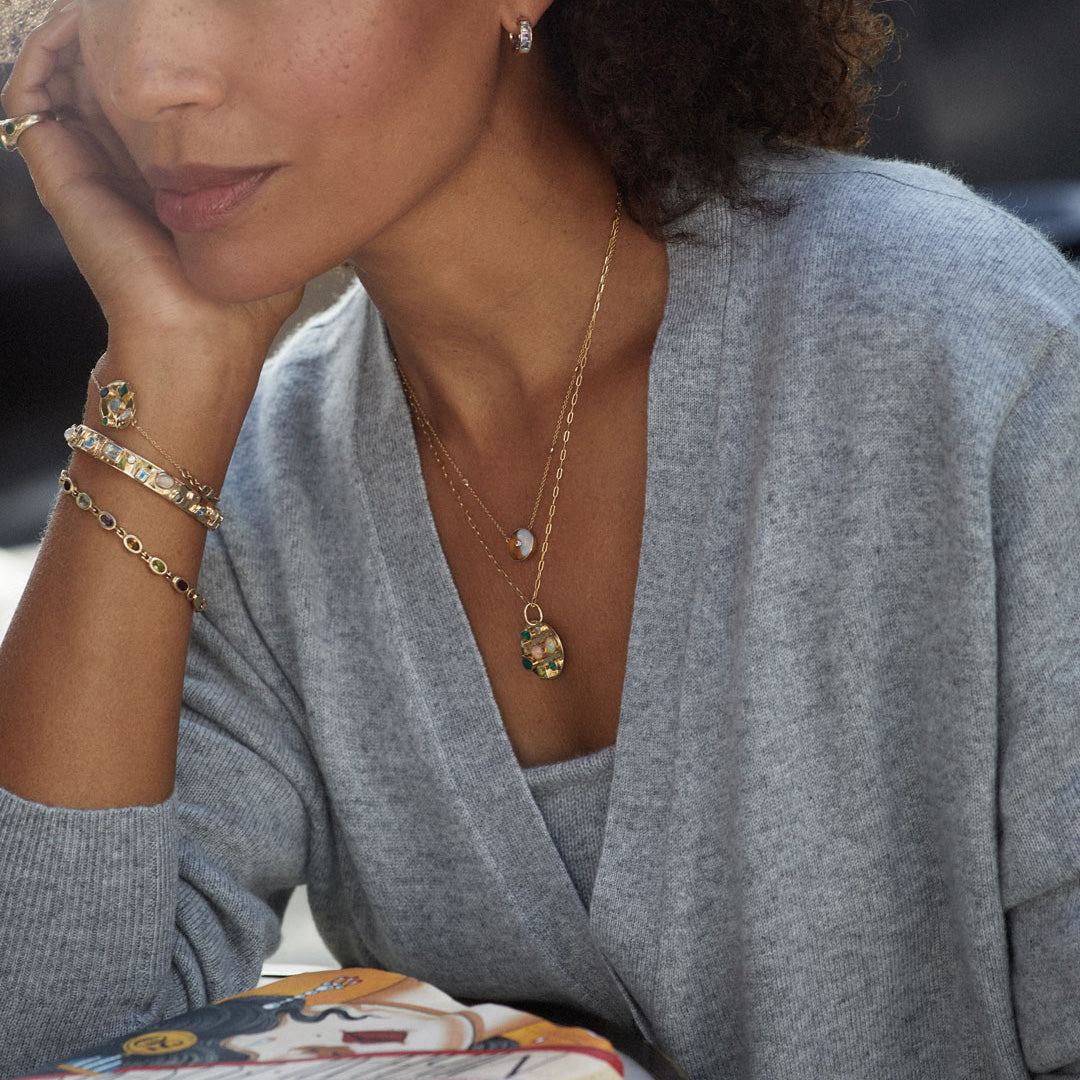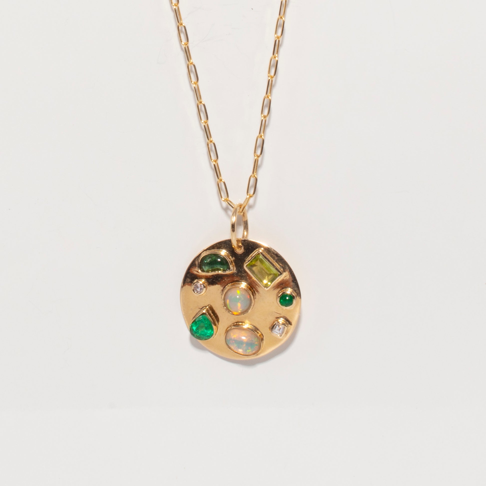 Our confetti disc pendant shines with her dazzling mixture of bezel set precious and semi precious gems. Layer her with your favorites or wear her alone, the Confetti disc pendant is a celebration all on her own.