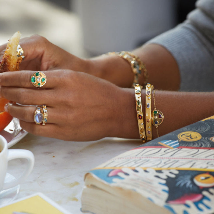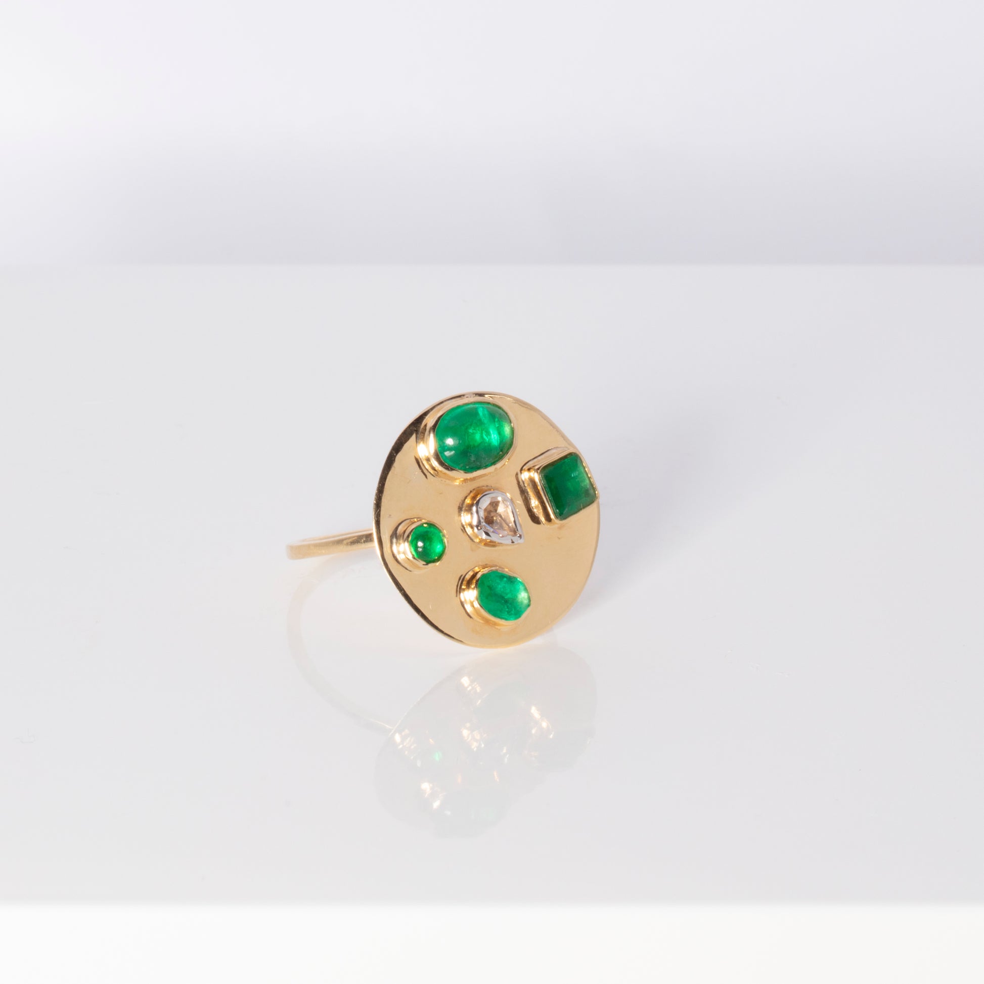 There's nothing like looking down at your hand and seeing the light bounce around in these gorgeous spirited emeralds and diamonds. These rings are made individually and are a scattering of colors and shapes, no two are alike.