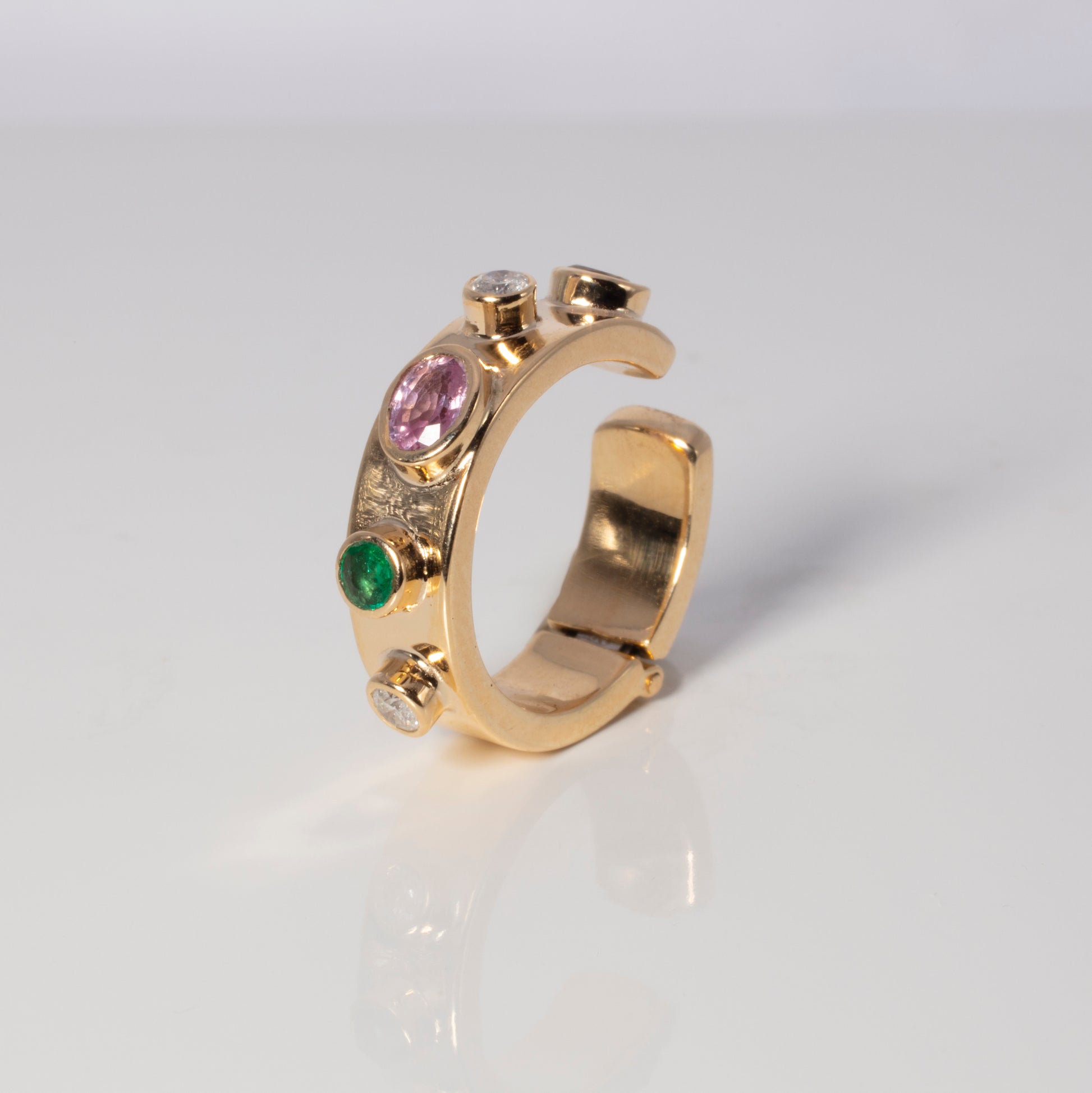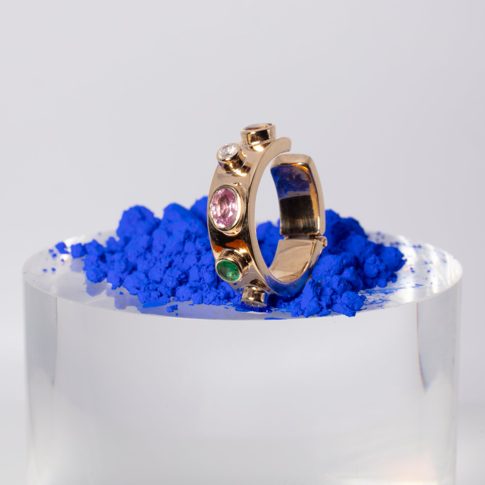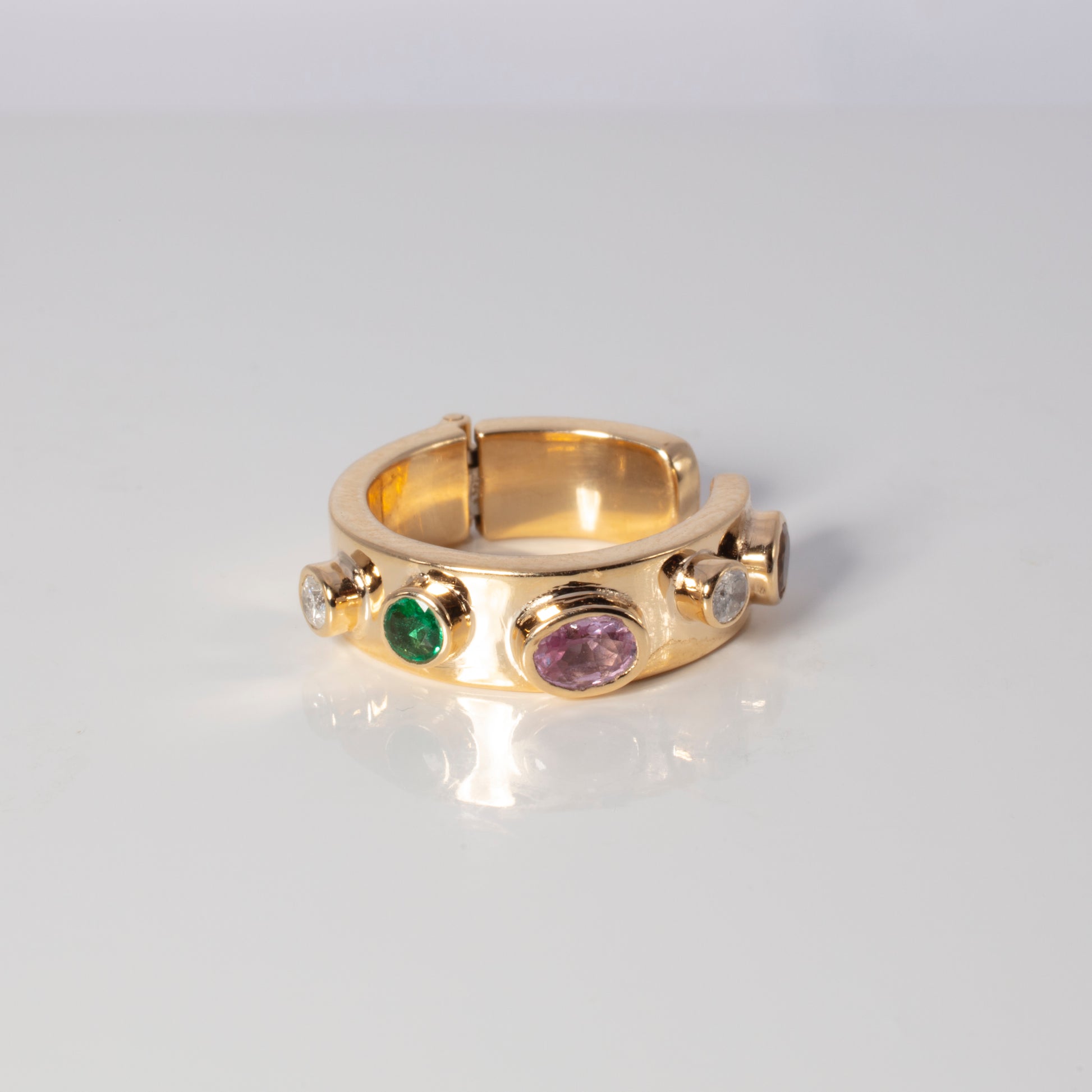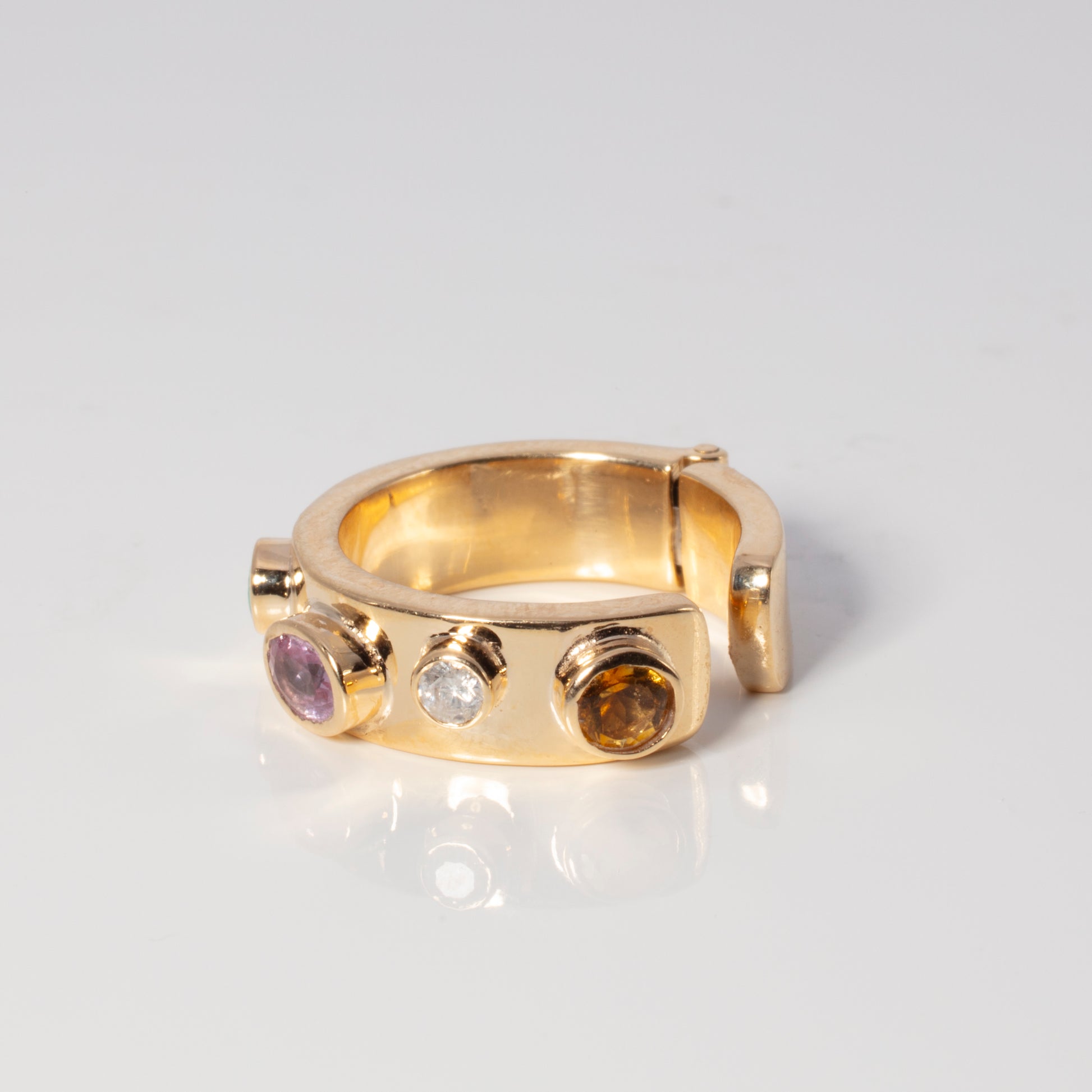 The edge of a cuff is softened by the colorful playfulness of the bezel set stones. One size hinged cuff.