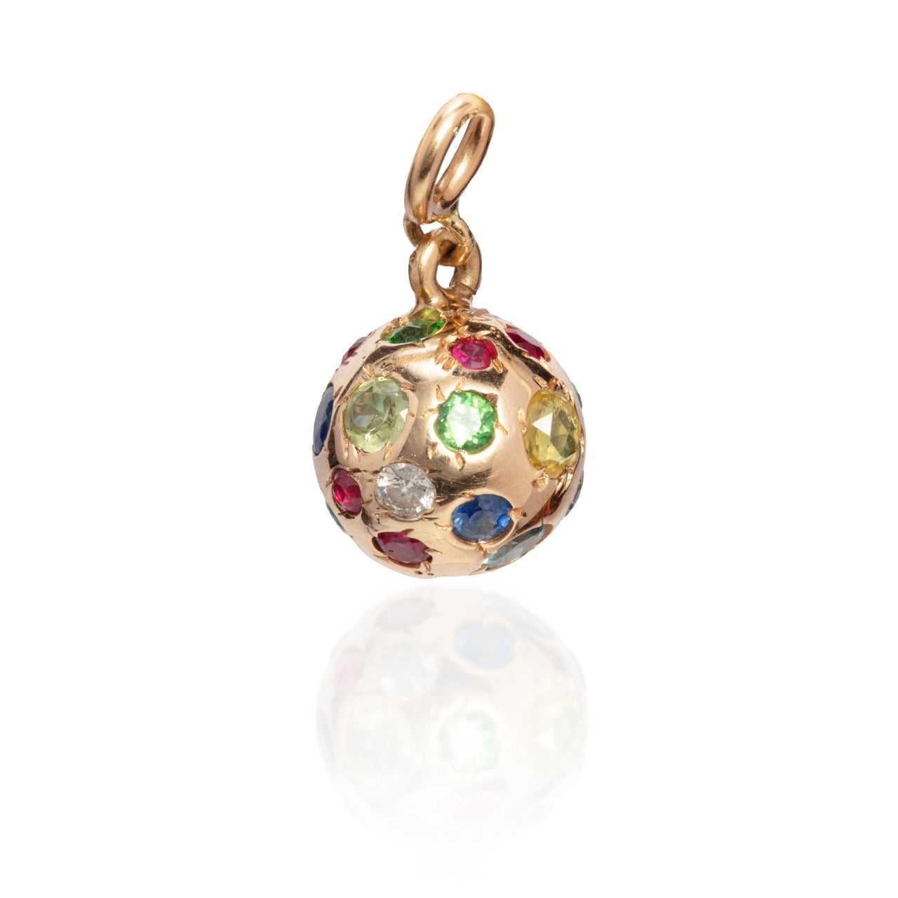 A dazzling little ball of warm 14k yellow gold filled with 1.5 carats of diamonds, emeralds, sapphires, rubies, tourmaline and blue topaz. Hang this from your favorite chain or clip it onto the clasp of a bracelet for some extra flair.