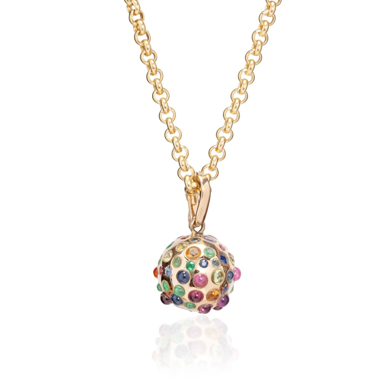 Hypnotize them with this dazzling array of colors and cuts. Set in a sphere of warm 14k yellow gold, there is an explosion of nearly 11 carats of diamonds, emeralds, sapphires, rubies, tourmaline, aquamarine, topaz, citrine, peridot, amethyst faceted and cabochon. If and when we make contact with someone else out there, we hope it looks something like this.