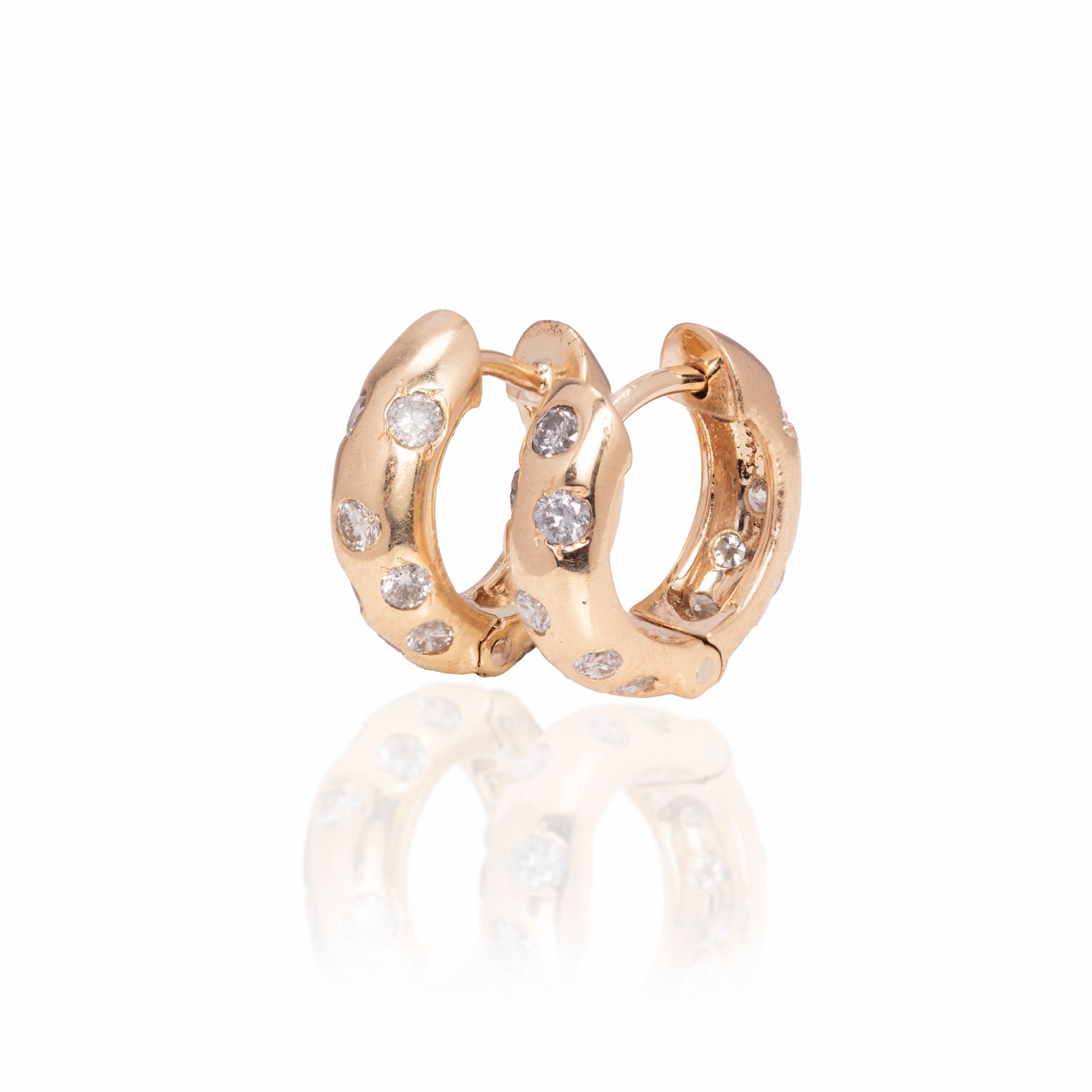 14k buttery yellow gold is covered with flush mounted diamonds with a few diamonds tossed in for good measure. These huggies are comfortable enough to sleep in and can be added on to to wear multiple in multiple piercings or by hooking them together