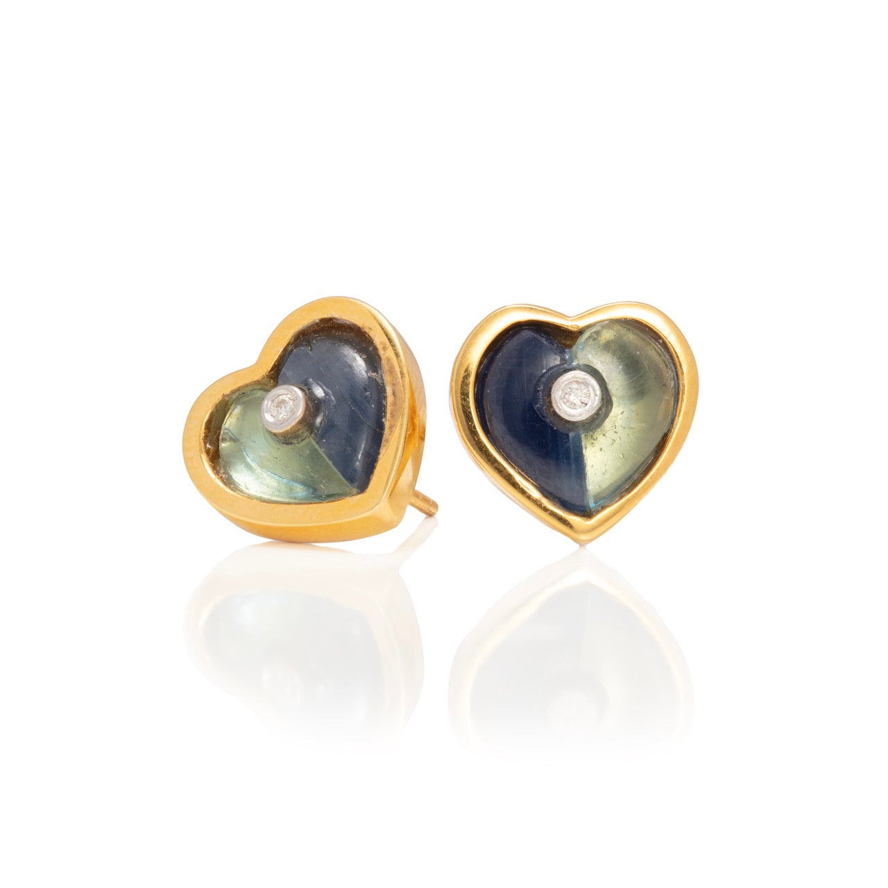 Bring in the love with these Nest heart stud earrings. Set in warm 14k yellow gold, a bezel set diamond nestles between 3 carats of Sapphire and blue topaz.