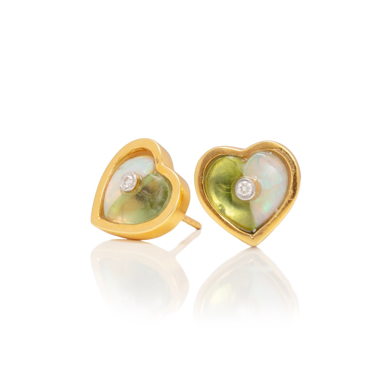 Bring in the love with these Nest heart stud earrings. Set in warm 14k yellow gold, a bezel set diamond nestles between 3 carats of Australian Opal and dazzling green tourmaline.