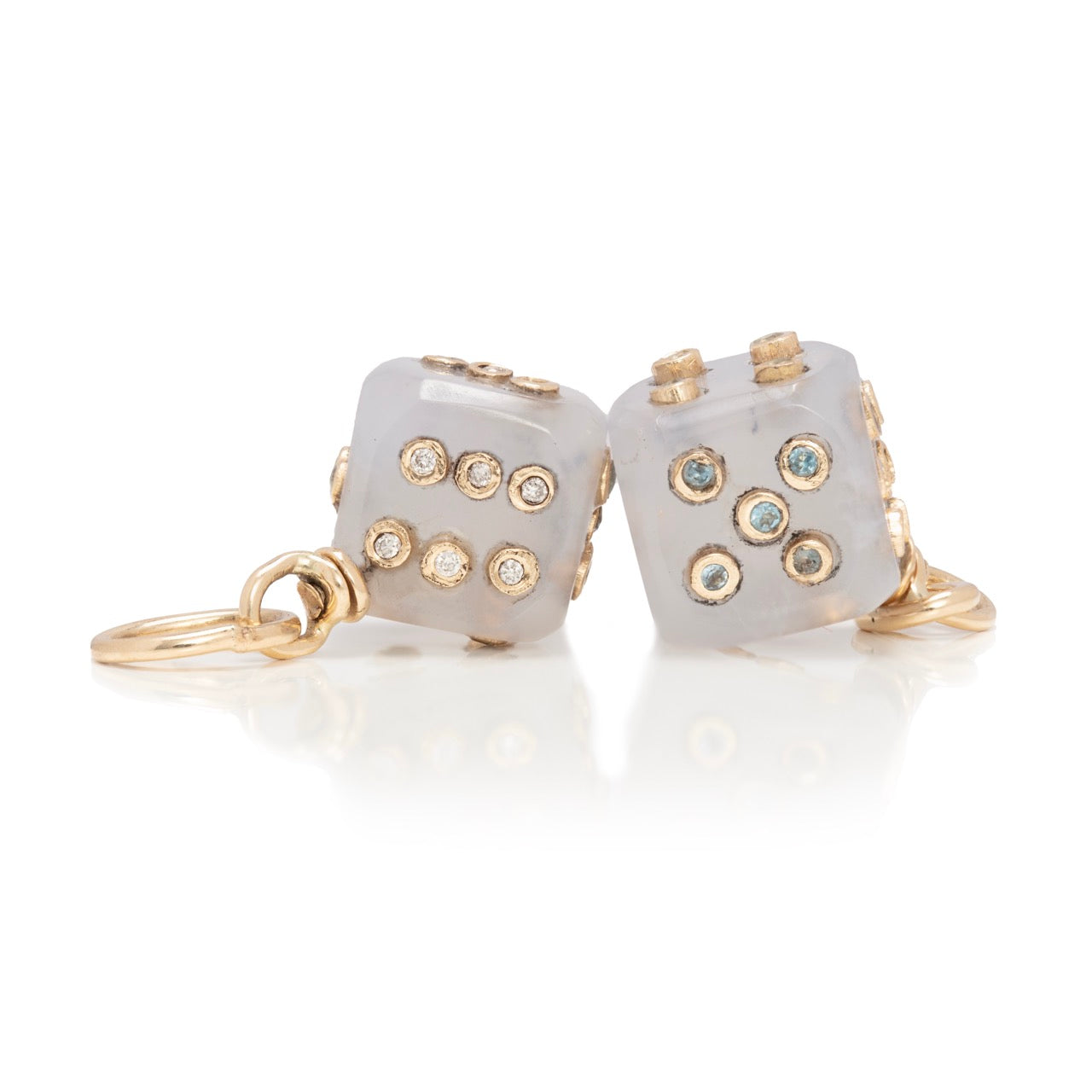 A gorgeous reminder to create your own luck, these handcrafted chalcedony dice with diamond and aquamarine pips bezel set in warm yellow 14k gold are the life of the party. Whether it’s a big life event or just a bit of daily encouragement, may as well roll the dice in style.