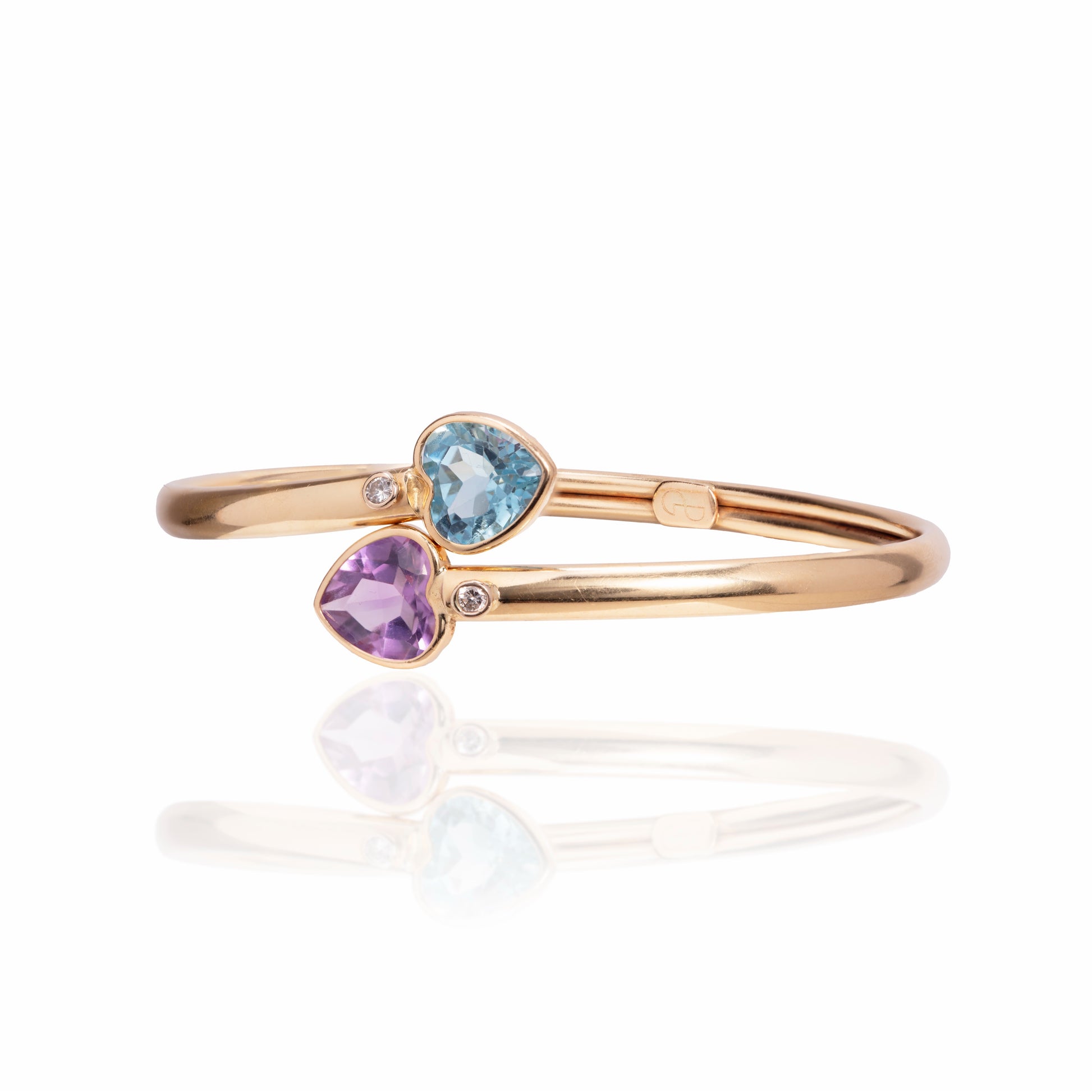 Two chunky hearts wrap around your wrist on flexible 14k yellow gold. Bright blue topaz and a pale purple amethyst hearts are punctuated by two bezel set diamonds.